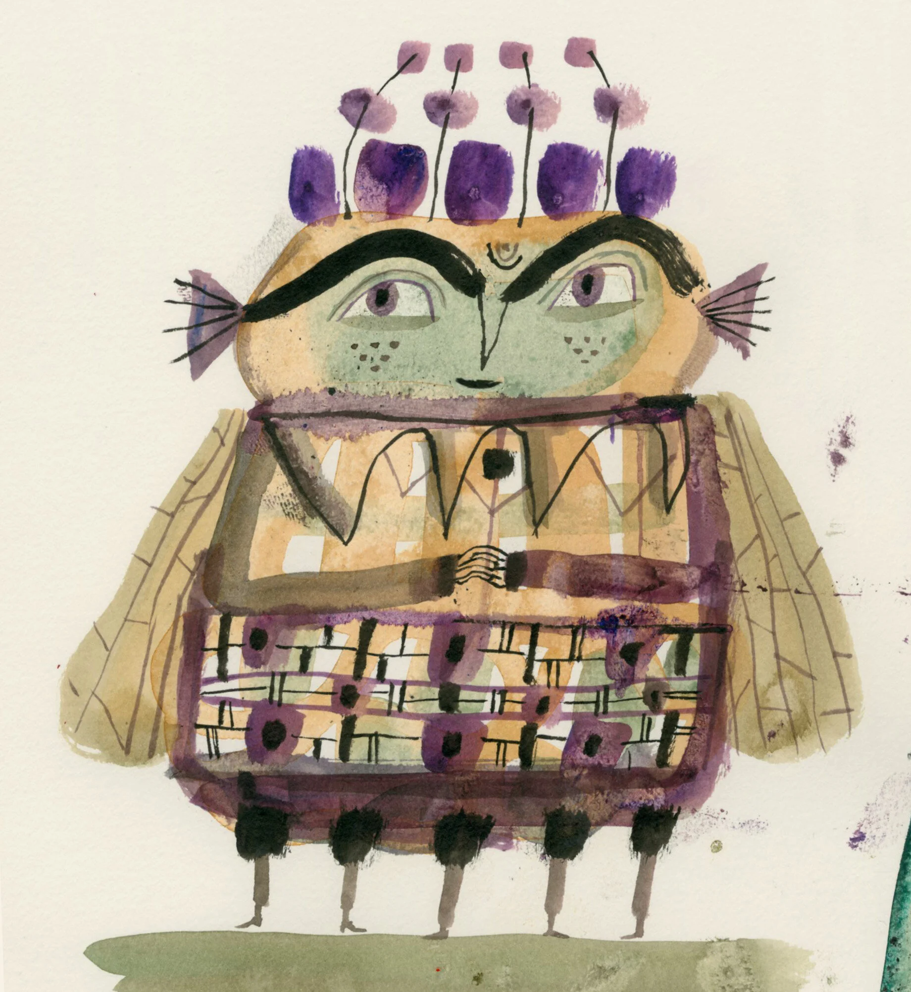 Birds and bird-creatures in sketchbook drawings. Ink and watercolor.